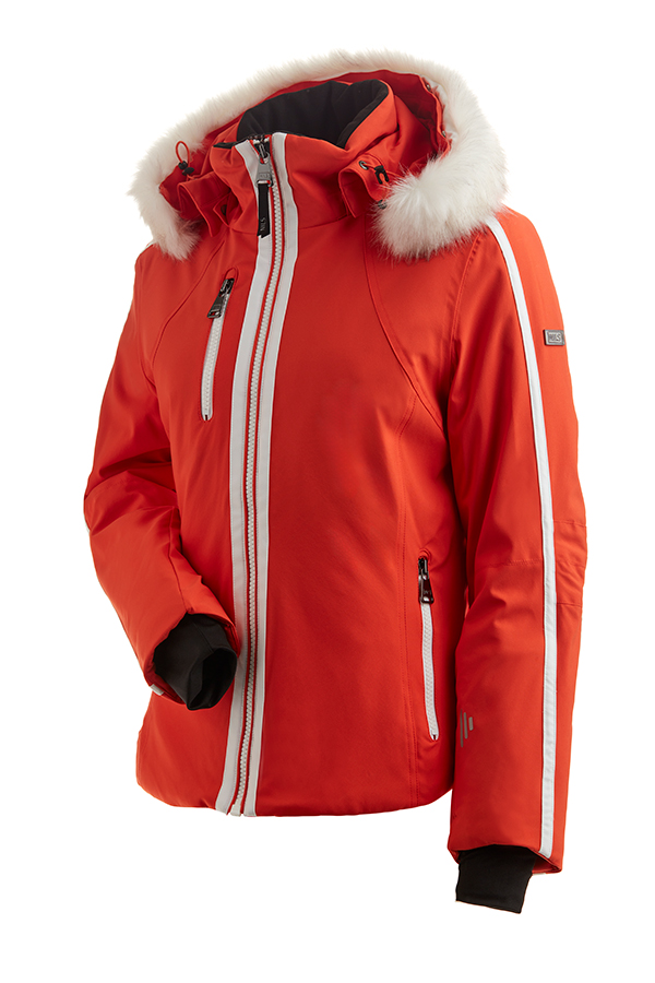 Sporty, 2-color ski/snowboard jacket in PETITE sizing with contrast stripes. This jacket features 2 handwarming pockets, a chest pocket, sleeve pocket and helmet compatible removable hood. This jacket is made of a 4-way stretch fabric and is designed with custom trims and YKK zippers. CBL 25". Waterproof/Breathable rating 20/20.