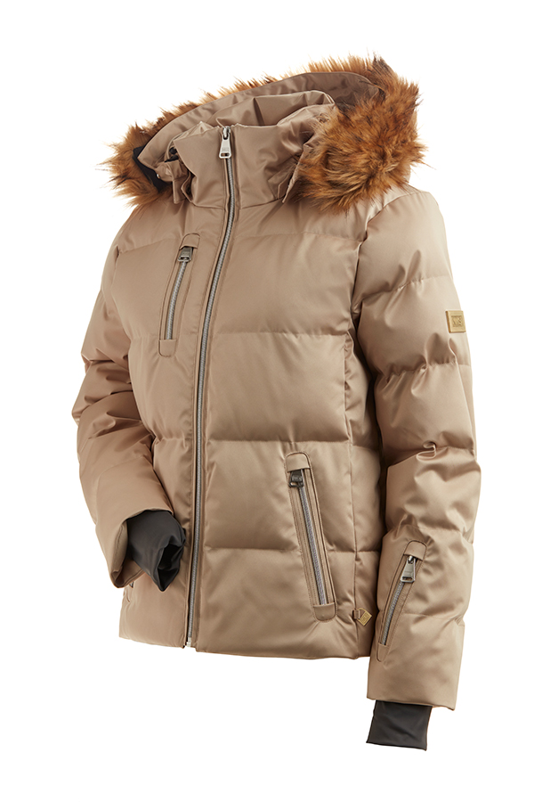 Solid ski/snowboard puffer jacket with removable faux fur. This jacket features 2 handwarming pockets, a chest pocket, a sleeve pass pocket and a helmut compatible hood. This jacket is made with a 4-way stretch fabric and is designed with custom trims a