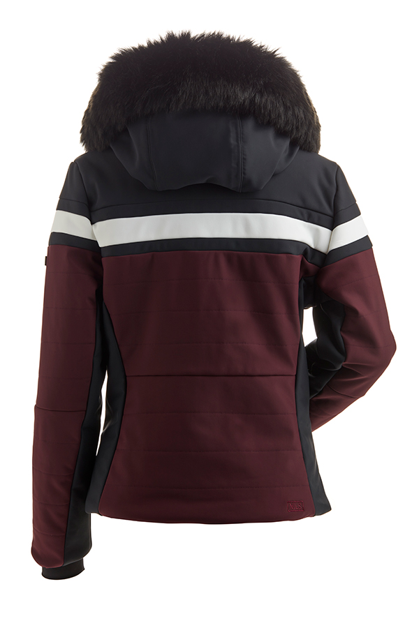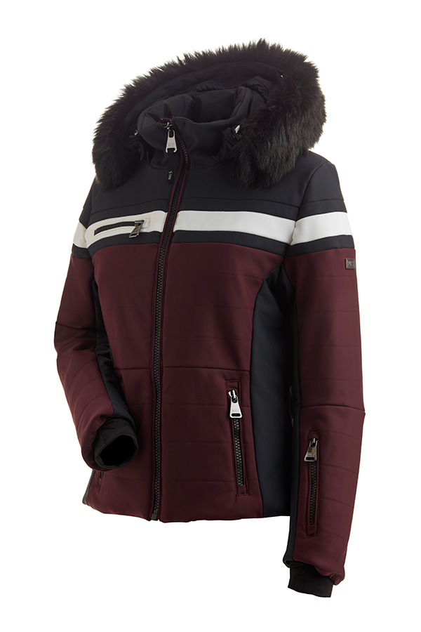 Sporty 3 color hip length ski/snowboard jacket with removable faux fur This jacket features 2 handwarming pockets, a chest pocket, a sleeve pass pocket and a helmut compatible hood. Shell- 3 layer, 4-way stretch using Dermizax fabric technology and is designed wiht custom trins and YKK zippers. CBL 26". Waterproof/Breathable rating 10/6