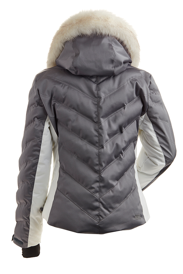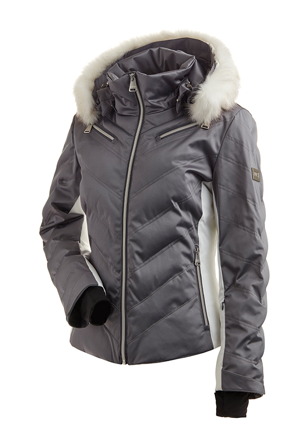 Solid and 2 color ski/snowboard jacket with quilting detail and removable faux fur. This jacket features adjustable tab cuffs 2 handwarming pockets, chest pockets, a sleeve pass pocket, and a helmut compatible hood. This jacket is made with a 4 way stre
