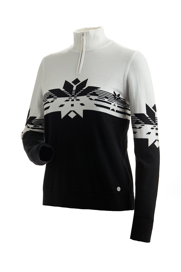 Classic 1/4 zip sweater with a jacquard snowflake design across the chest. This double knit sweater is made from rich and luxuriouis yarns that will keep you warm on and off the slopes.